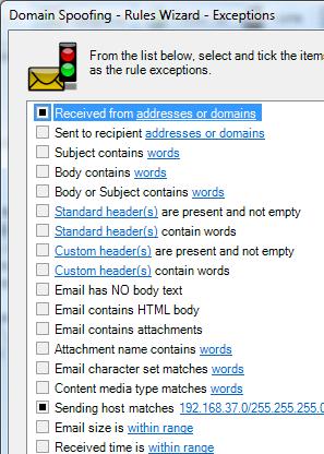 This will block all emails claiming to be from our domain. Such a filter may be readily employed at many organizations with zero false positives. This is due to the simple reason that very often there exists no legitimate reason for an internet originating email to claim to be from our own domain. This is especially true when considering that IMF Tune by default only processes emails originating from the internet over anonymous (un-authenticated) connections. Such a filter does not affect users sending outbound emails or anyone accessing emails over authenticated connections. More Selective Blacklisting Using Advanced SCL RulesAlthough the simple blacklist might do the job, sometimes we have to cater for exceptions. There might be some legitimate hosts that use our domain at the sender to submit inbound emails over anonymous connections. For example an organization might be running applications that generate such emails for reporting purposes. Typical applications include monitoring, accounting and fax-to-email gateways. In addition there might also be some senders that specifically need to be excluded from such a blacklist. In these cases instead of the simple blacklist, we employ an Advanced SCL Rule to build a more selective filter.