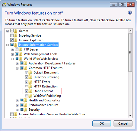 This happens if the IIS Static Content Service is not installed. To solve the problem we just need to install this service. In II7 go to: